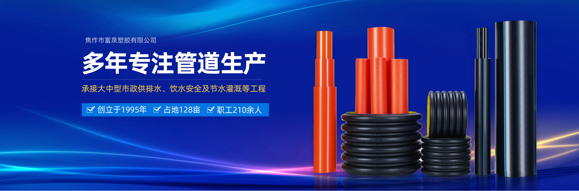 -   焦作市富泉塑膠有限公司,創立于1995年,是一家集研發、設計、生產、銷售為一體的大型管材企業。公司位于太極故里、黃河之濱一一河南焦作溫縣。公司占地128畝,現有職工210余人,其中具有中技術職稱的19人。生產、檢驗設備58臺(套),包括PVC實壁管生產線11套、PE實壁管生產線12套、HDPE雙壁波紋管生產線6套、PVC雙壁波紋管生產線5套,檢驗設備14臺(套)。主要產品有:Φ20mm-630mm、各種壓力規格的PVCU、PVC-M、PE給水管材,PVC-U節水灌溉管材,HDPE燃氣和礦用管材,DN200-800mm的HDPE、PVC雙壁波紋管及各種噴灌、滴灌工程材料。承接大中型市政供排水、飲水安全及節水灌溉等工程?! 「蝗苣z公司重視產品的質量、安全、環保和節能,在同行業中率先完成了“新華節水產品認證”,全方面通過ISO9001:2008國際質量管理體系、IS014001:2004環境管理體系和OHSAS18001職業健康安全管理體系的一體化導入,并建立起規范的現代企業管理體系。公司以“質量”為先導,采用質量跟蹤、多環節把關的方法,組建具有行業水準的企業技術檢測中心,常年委托水利部節水灌溉設備檢測中心、河南省產品質量監督檢驗院對產品跟蹤檢測,并由中國人民保險公司承保產品質量。公司連續多年被河南省水利廳確定為“安全飲水設備、節水灌溉設備”定點生產企業,并獲得“中國名優產品”“質量、服務、信譽AAA企業”“河南省**產品”“河南省水利企業”“河南省守合同、重信用企業”等榮譽稱號。  富泉塑膠公司堅持“用戶為上”的服務理念,長期以來,全方面關注客戶價值,不斷提升服務水平。服務隊伍常年為客戶的產品設計、施工、安裝提供合理的方案和全程細致、周到、**、快捷的技術服務。公司自成立以來,一直堅持以人為本的宗旨,塑造企業形象,并致力于新產品的開發,憑借雄厚的技術開發能力,先進的工藝制造流程,嚴格的質量管理保證體系,優良的售后服務網絡,已成為河南省大的飲水、灌溉及排水管材設備制造商。產品暢銷全國,而且還以公司雄厚的綜合實力在業界中占據著重要的地位。